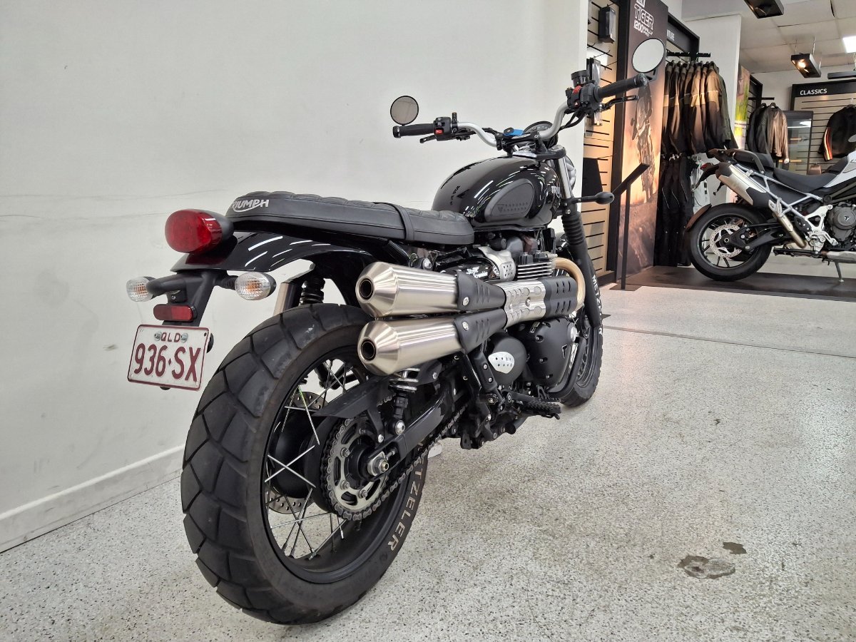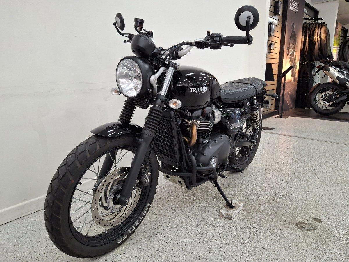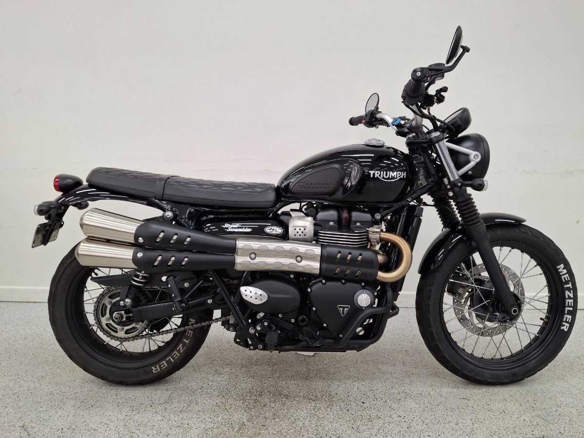 2018 Street Scrambler!!!^^The Triumph Street Scrambler gets switchable traction control, ABS, ride-by-wire and slip-assist clutch all wrapped up in an ultra-friendly package. Traction control and ABS are quickly turned off by thumbing the ?Info? button on the switchgear. It also has removable rubber pegs and a bashplate as well as an exquisite new exhaust system. The Street Scrambler sets itself apart from the Street Twin with its scrambler styling, raised and wider handlebar, a more relaxed riding position thanks to a higher and new seat, slightly more forward pegs, a larger 19? spoke front wheel, new mirrors, new longer suspension units front and rear with 120mm travel, posh side mounted exhaust system, uprated Nissin front brake With up to a 3 year mechanical protection plan and the most competitive finance and insurance packages available, as Australia?s largest motorcycle retailer no one makes it easier to purchase a used Motorcycle. Plus we can organise to have your bike delivered directly to your door anywhere in Australia through our dedicated motorcycle freighters. This Approved Used Bike comes with a 49-Point Quality Inspection, 2-Day FREE Exchange and 90 Day Mechanical Protection Plan extension when you purchase a 1, 2 or 3 year plan. Ensuring peace of mind, ease & convenience. An Approved Used Bike is the best choice in Australia for your next bike. Why buy elsewhere?